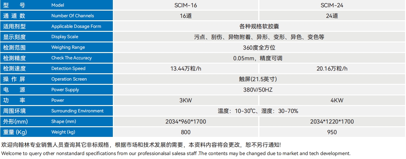 SCIM-16/24 360度软胶囊表面检测装备接纳机器视觉和AI+GPU的高速图象处置手艺,可以或许或许或许或许对软胶囊破坏、凹坑、污渍、异形等缺点停止检测。自立研发的节制系统、机器传动和光学视觉系统,保障软胶囊可以或许或许或许或许被360度无死角的切确检测。 SCIM-16/24装备利用简略、易于保护、检测速率快、精度高,能大幅度下降制药企业的出产本钱。