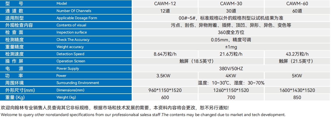 CAWM-12/30/60胶囊表面分量检测一体机接纳进步前辈的高清视觉系统和AI算法的高速图象处置手艺,和欧洲进步前辈的称量模块,和不变的机器布局相连系,再加上靠得住的节制系统,不只能对胶囊破坏、斑点、污渍、异形、插劈、顶凹等缺点停止检测,同时还能精准的检测胶囊分量的装配。该装备还包罗多项自立研发的进步前辈手艺,包罗机器布局、高速图形收罗系统和AI缺点辨认算法,对胶囊表面停止高速360度全方位的切确检测,同时对胶囊的装量停止精准称量,其速率可达2次/秒且可以或许或许或许或许对缺点胶囊停止主动剔废处置,处置了野生检测的客观情感、委靡身分、精准度和速率等题目,从而大幅度下降了制药企业的出产本钱。