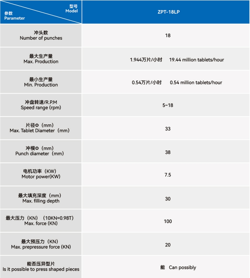 | 型号 | 冲头数 | 冲模范例 | 冲盘转速 | 最大产量:片/小时 | 主机电功率 | 主压力 | 预压力 | 最大片径 |