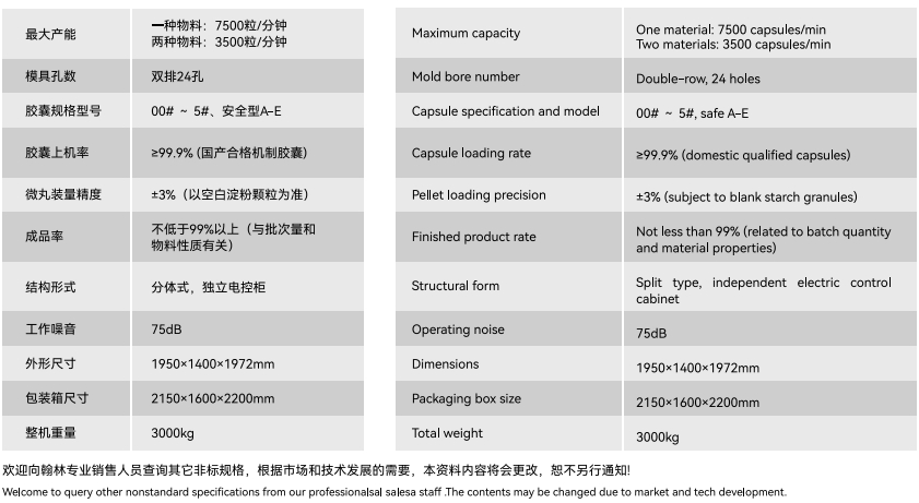 | 型号 | 出产才能 (粒/分钟) | 模具孔数 | 合用胶囊 | 装量精度 | 任务乐音 | 总功率 | 形状尺寸 | 装备毛重 |